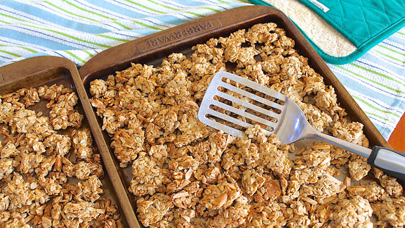 Pomešati zajedno navedene suve sastojke. U posebnom sudu pomešati mokre sastojke i sve izmešati zajedno. Zagrejati rernu na 180 stepeni. Mešavinu usuti na pek papir i peći oko 20 minuta uz povremeno mešanje smese. Kada se granola ohladi, čuvati je u staklenoj teglici.